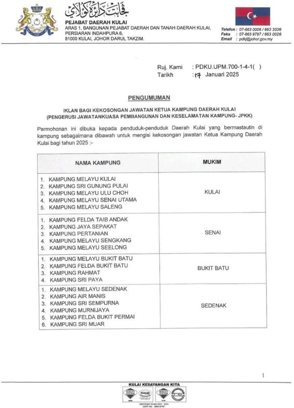 Iklan Jawatan Kosong Pejabat Daerah Kulai