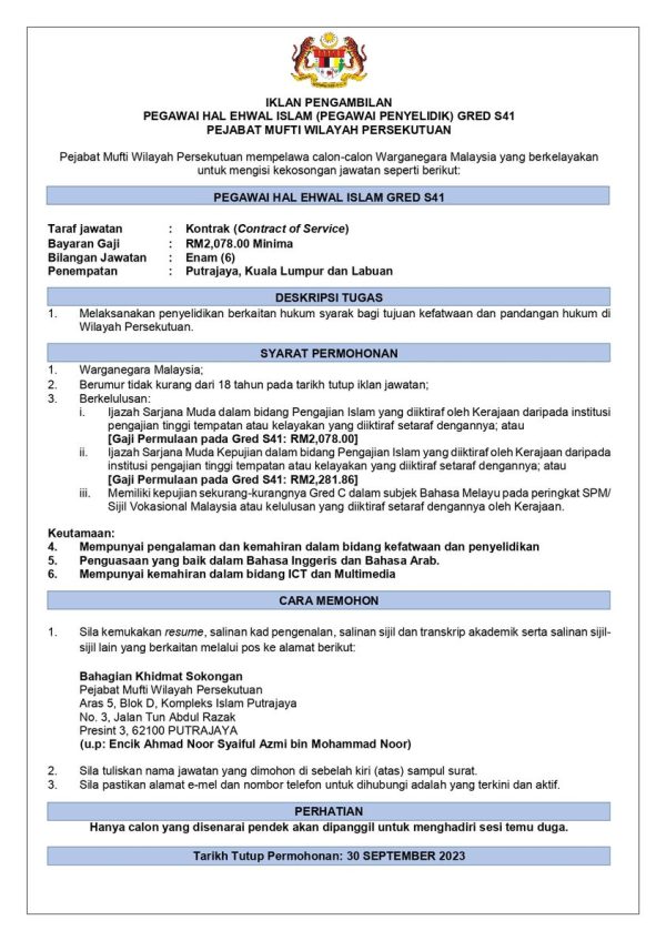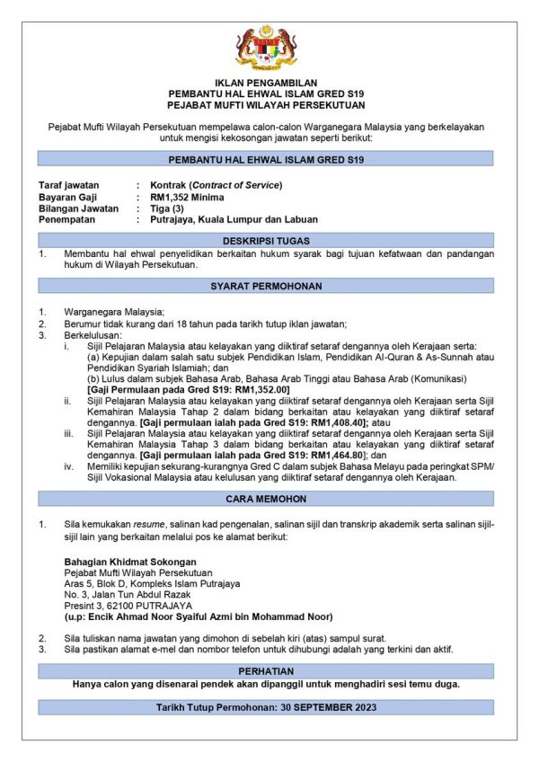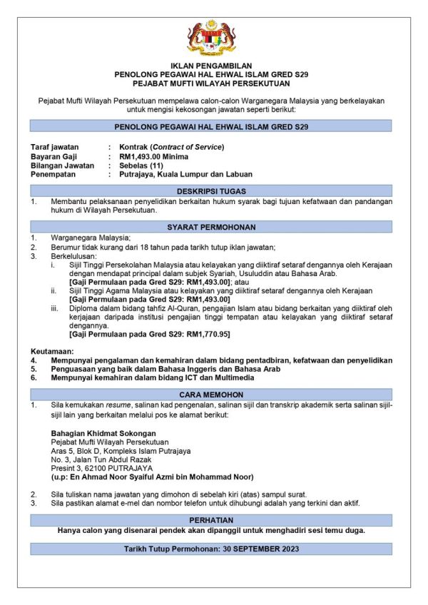 Iklan Jawatan Kosong Pejabat Mufti Wilayah Persekutuan