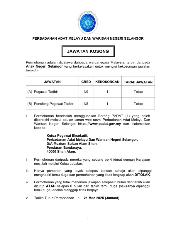 Iklan Jawatan Kosong Perbadanan Adat Melayu Dan Warisan Negeri Selangor