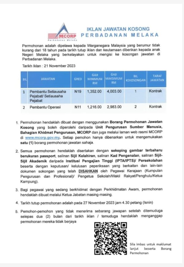 Iklan Jawatan Kosong Perbadanan Melaka (MCORP)