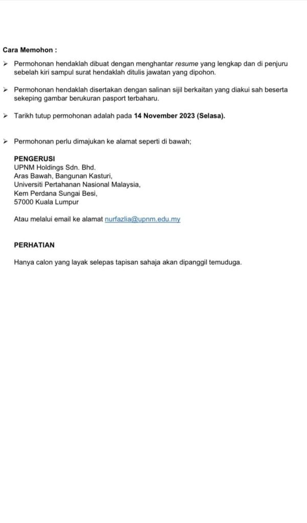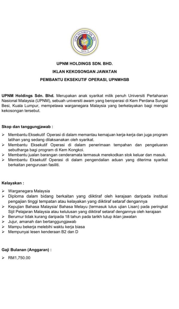 Iklan Jawatan Kosong UPNM Holdings Sdn Bhd