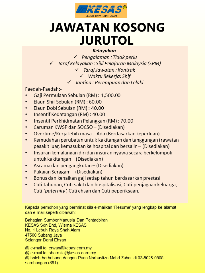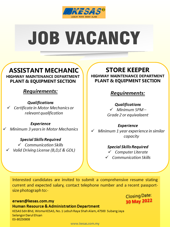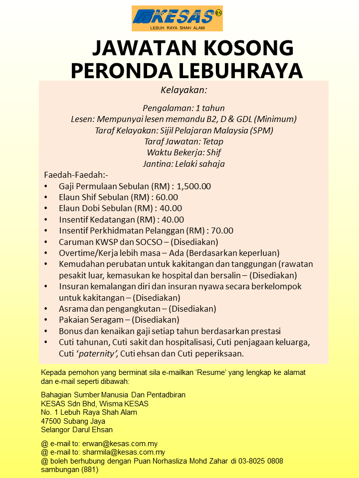 Iklan Jawatan Lebuh Raya Shah Alam (KESAS)