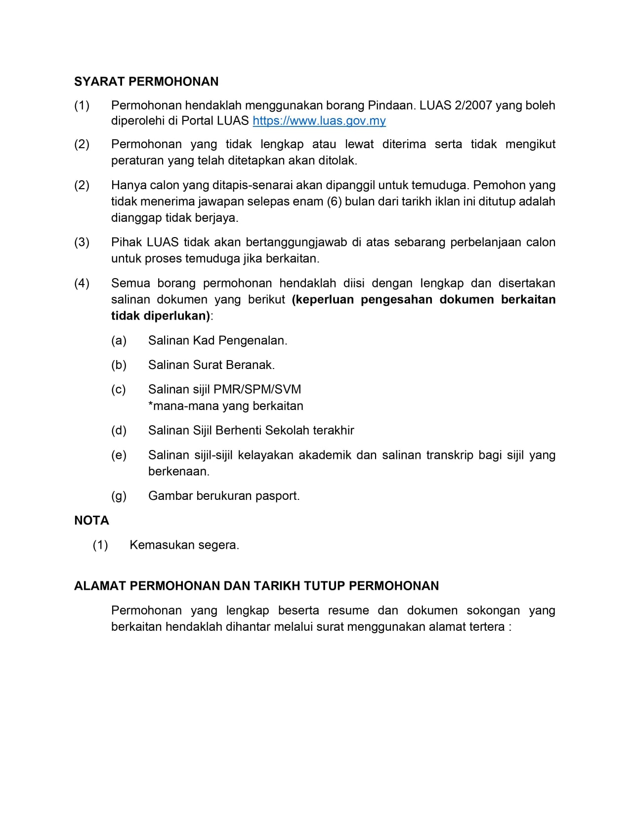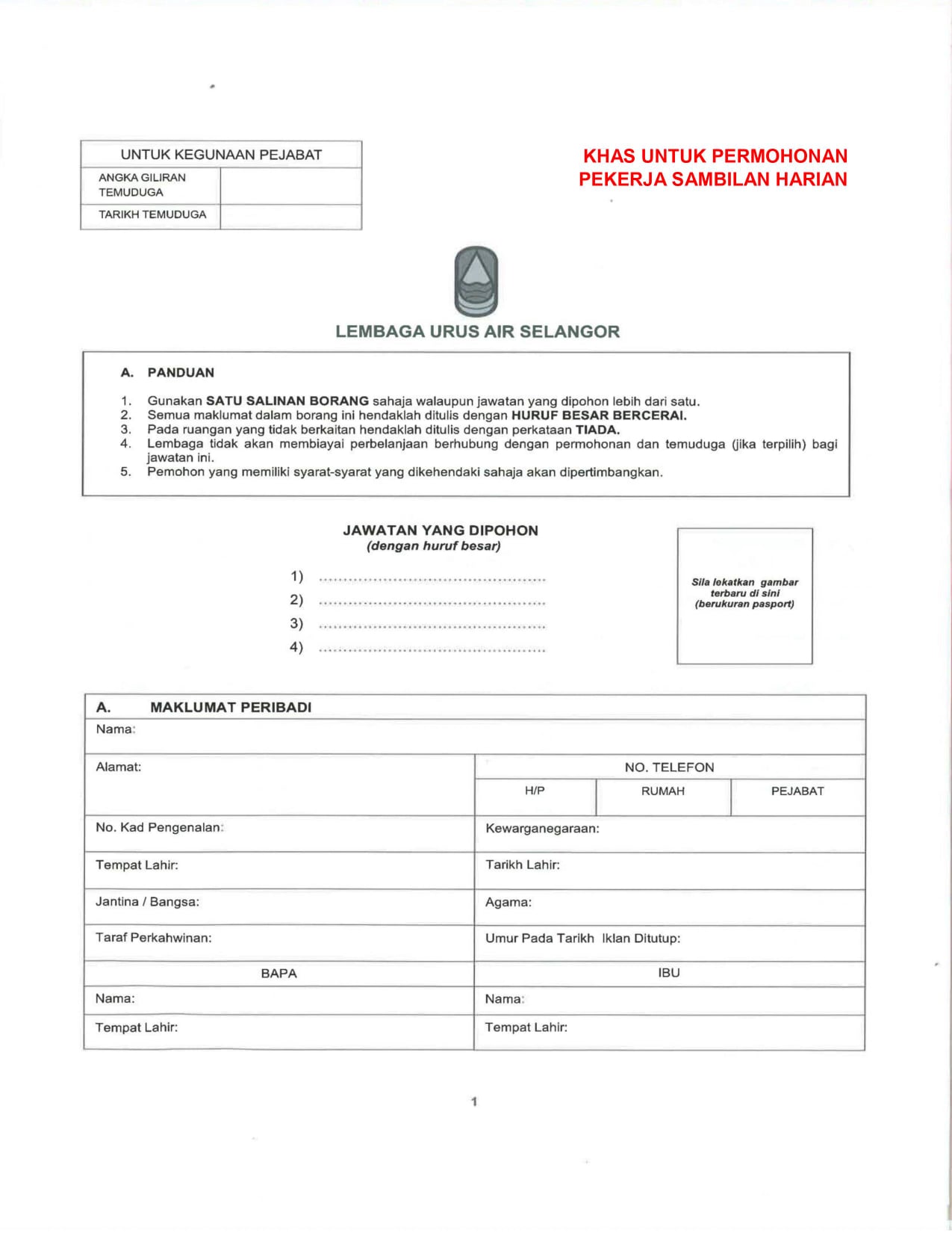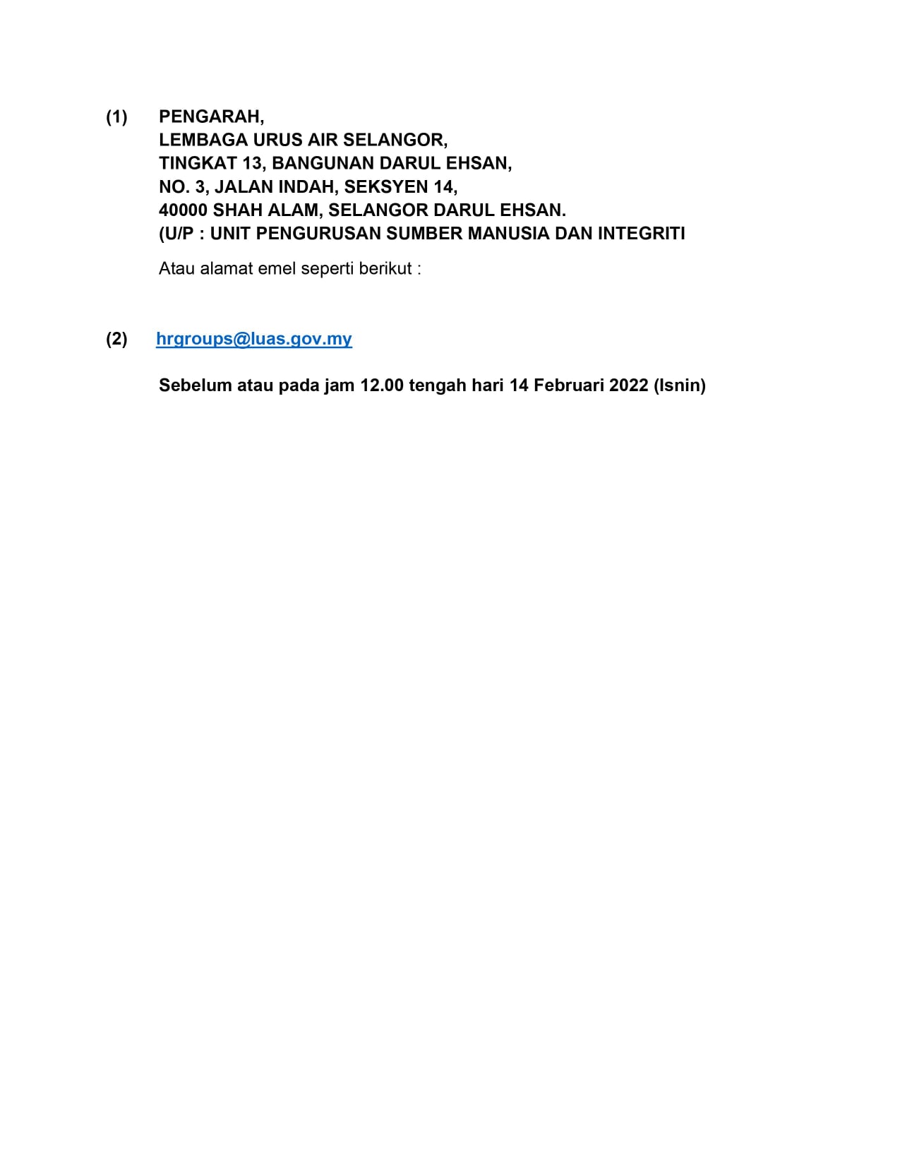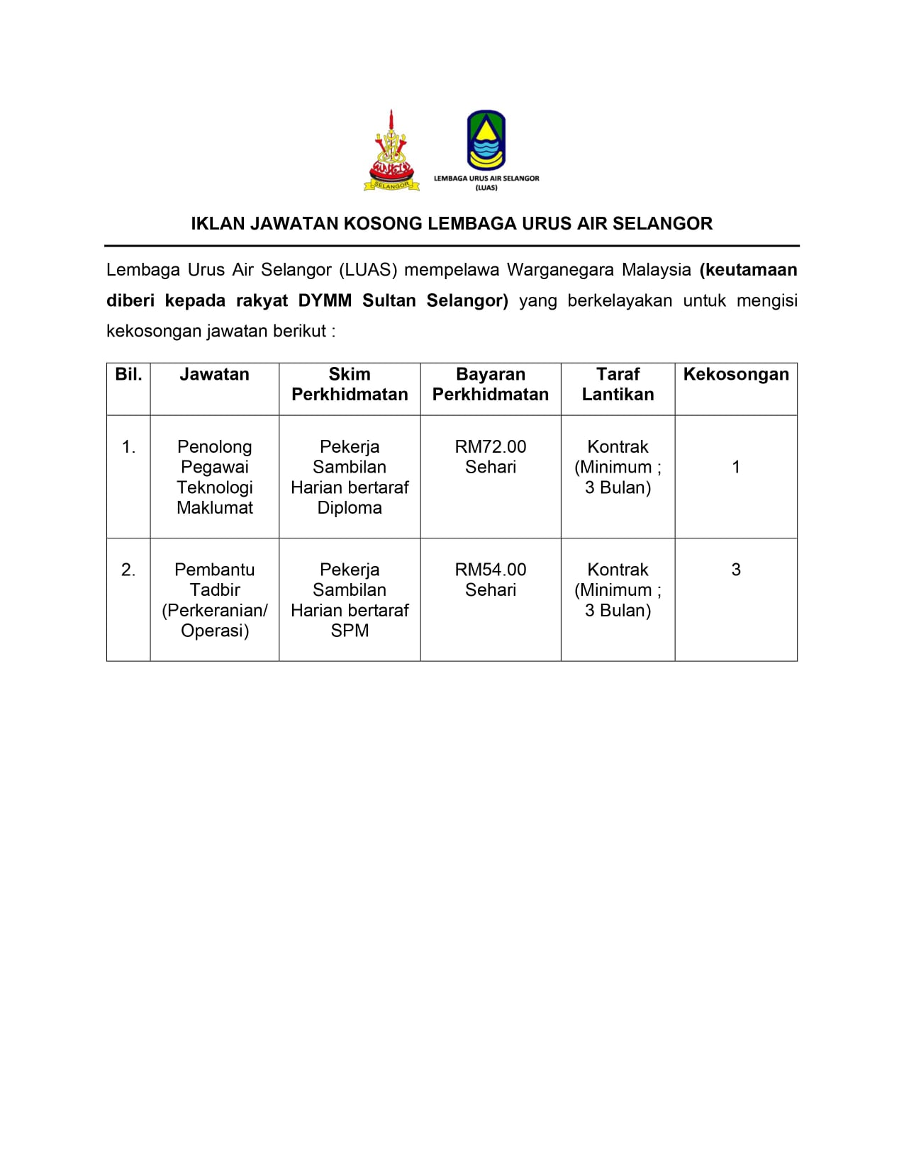 Iklan Jawatan Lembaga Urus Air Selangor (LUAS)