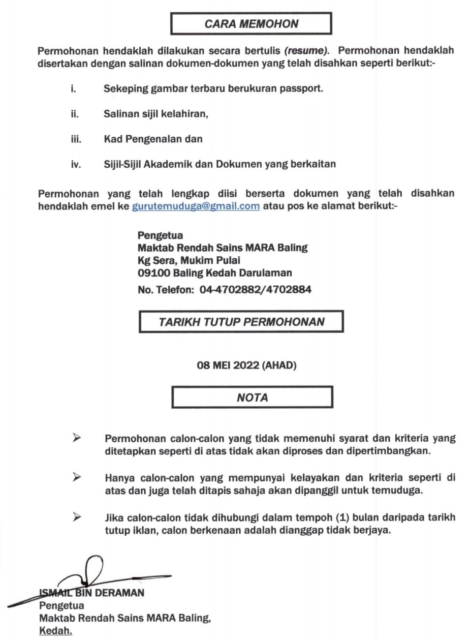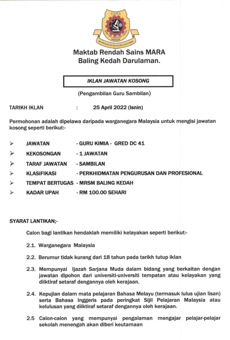 Iklan Jawatan Maktab Rendah Sains MARA Baling