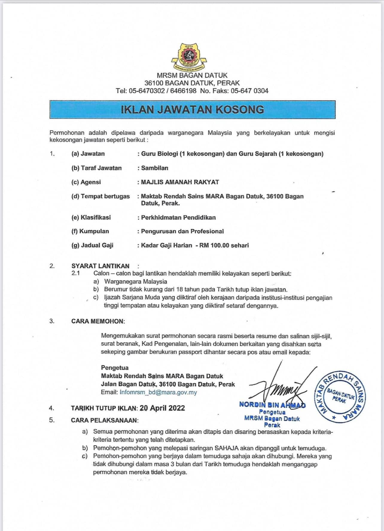 Iklan Jawatan Maktab Rendah Sains Mara (MRSM) Bagan Datuk