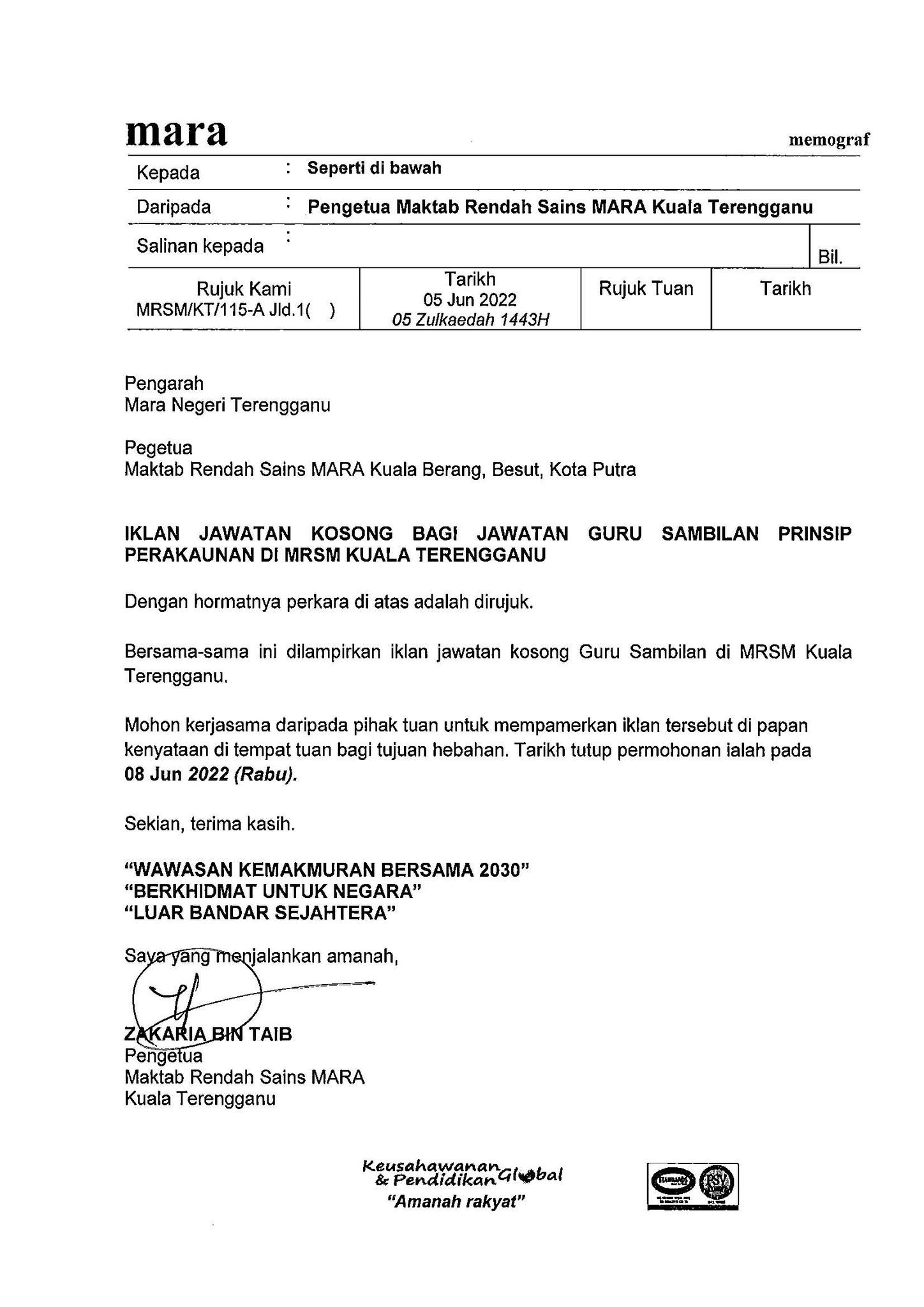Iklan Jawatan Maktab Rendah Sains Mara (MRSM) Kuala Terengganu