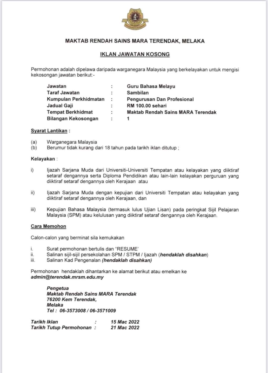 Iklan Jawatan Maktab Rendah Sains Mara (MRSM) Terendak