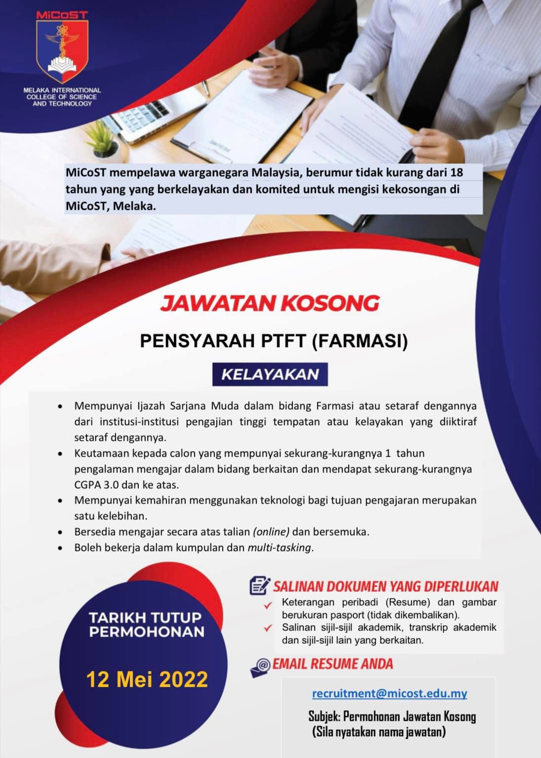 Iklan Jawatan Melaka International College of Science and Technology (MiCoST)