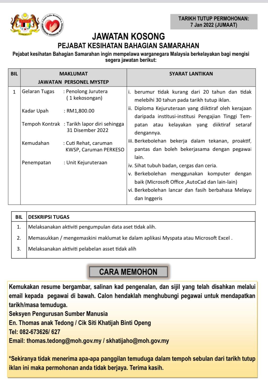 Iklan Jawatan Pejabat Kesihatan Bahagian Samarahan