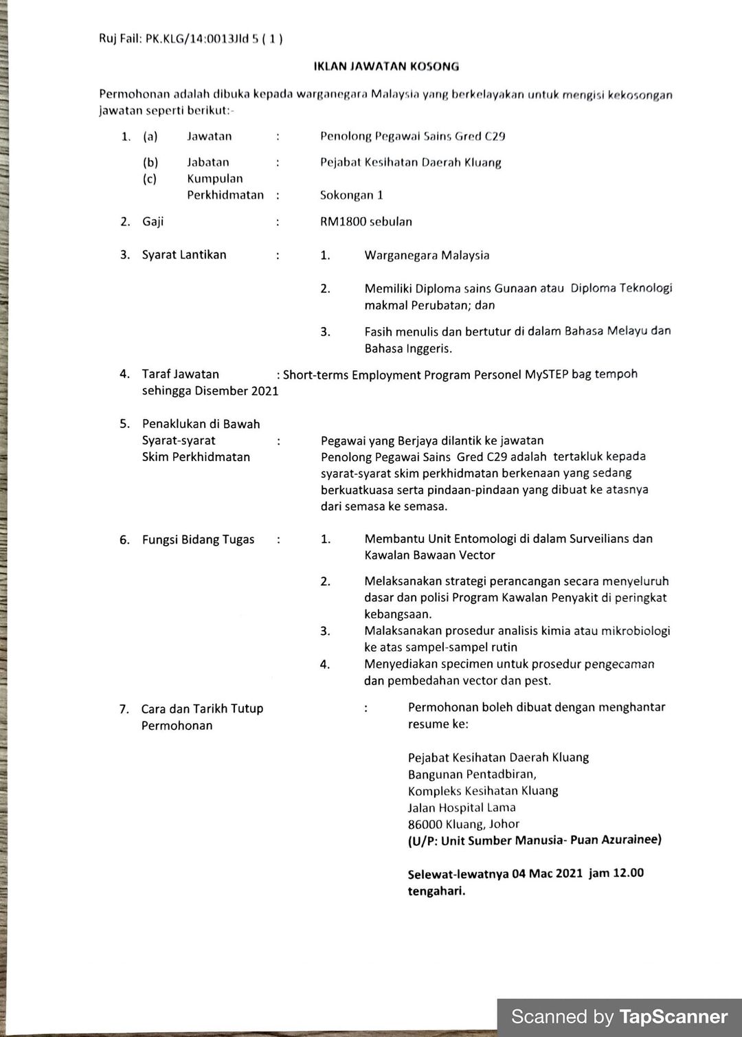 Iklan jawatan Pejabat Kesihatan Daerah Kluang