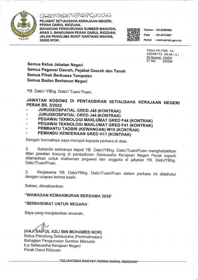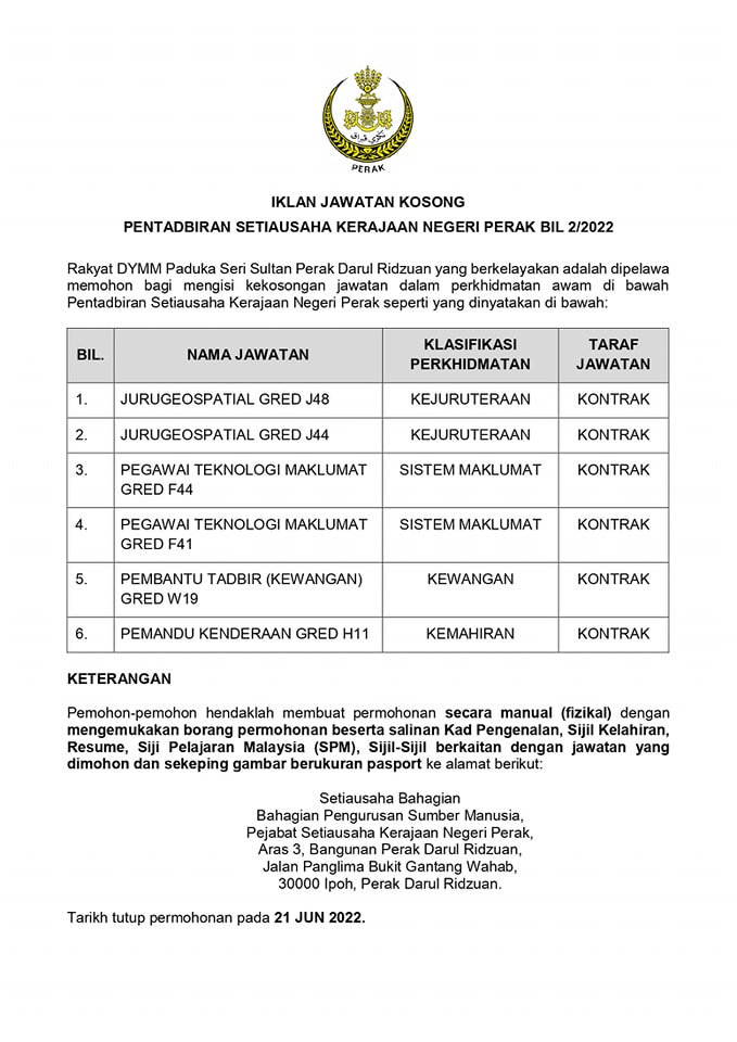 Iklan Jawatan Pentadbiran Setiausaha Kerajaan Negeri Perak