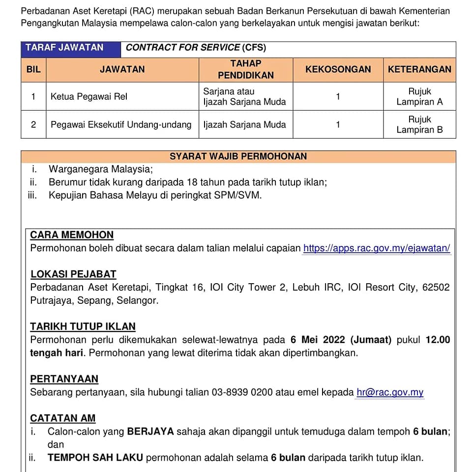 Iklan Jawatan Perbadanan Aset Keretapi (RAC)