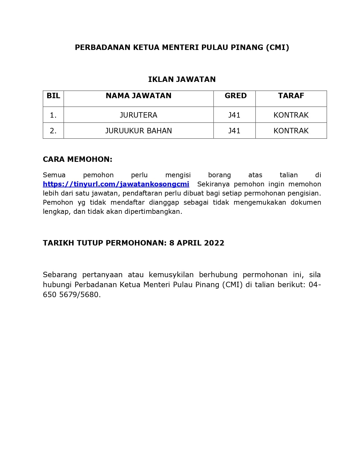 Iklan Jawatan Perbadanan Ketua Menteri Pulau Pinang