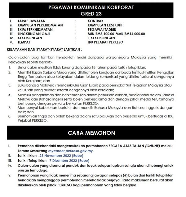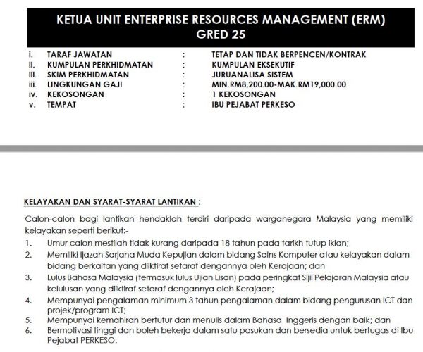 Iklan Jawatan Pertubuhan Keselamatan Sosial (PERKESO)