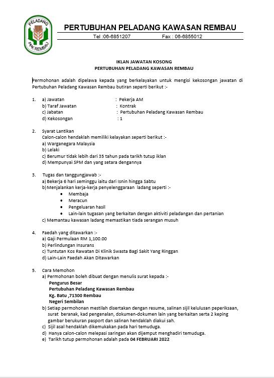 Iklan Jawatan Pertubuhan Peladang Kawasan Rembau