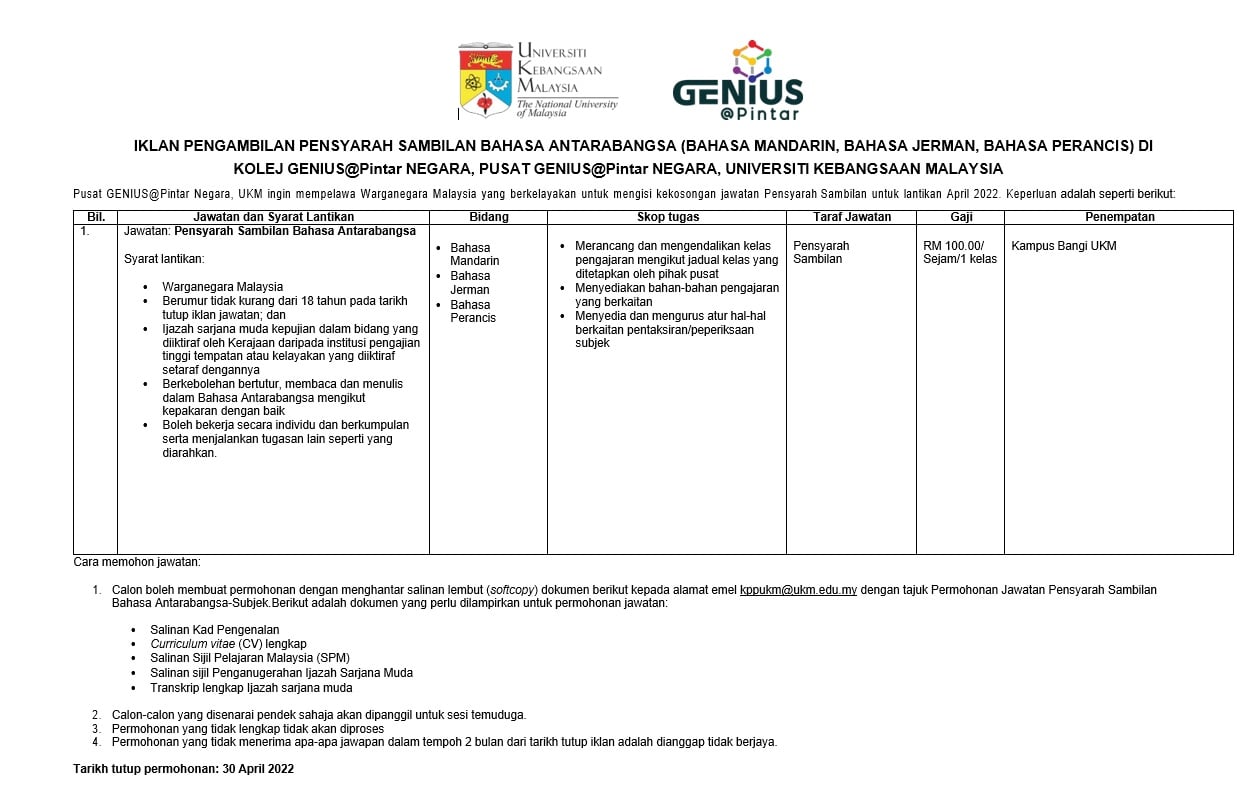 Iklan Jawatan Pusat GENIUS@Pintar Negara UKM