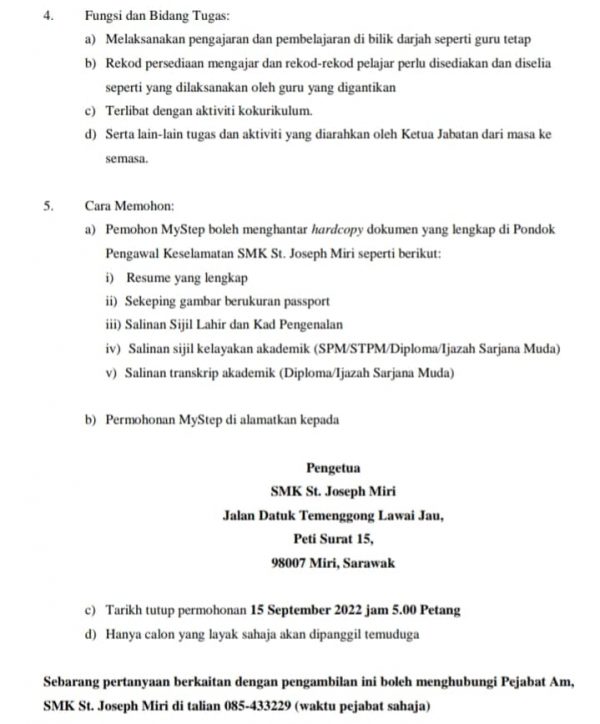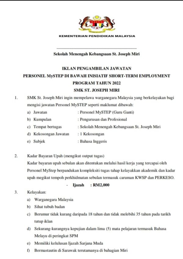 Iklan Jawatan Sekolah Menengah Kebangsaan St. Joseph Miri