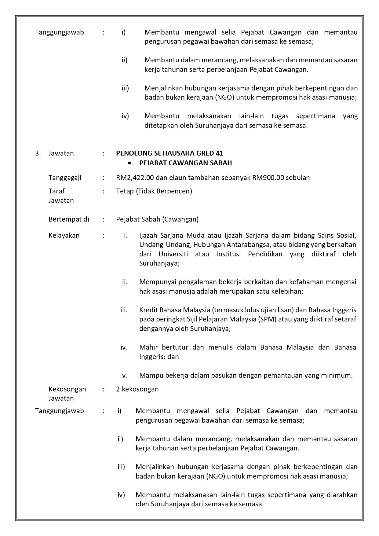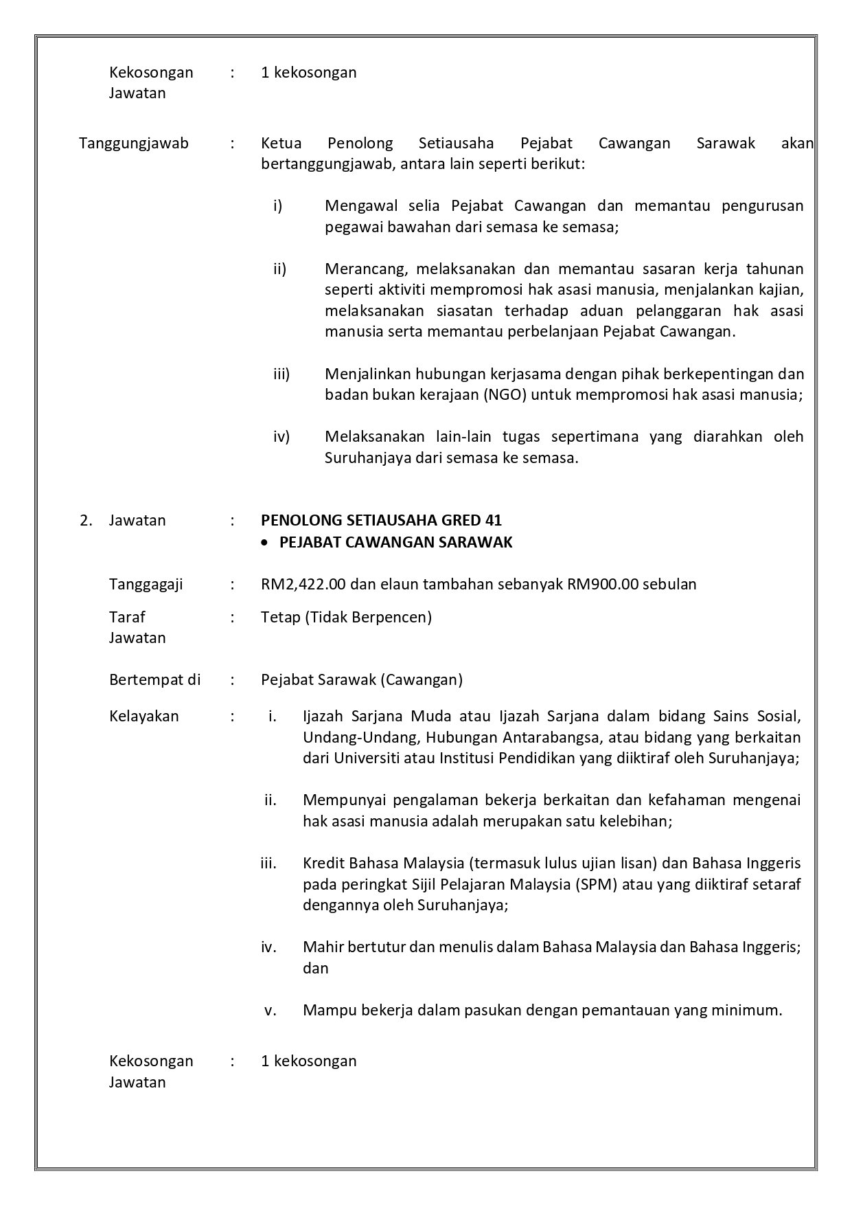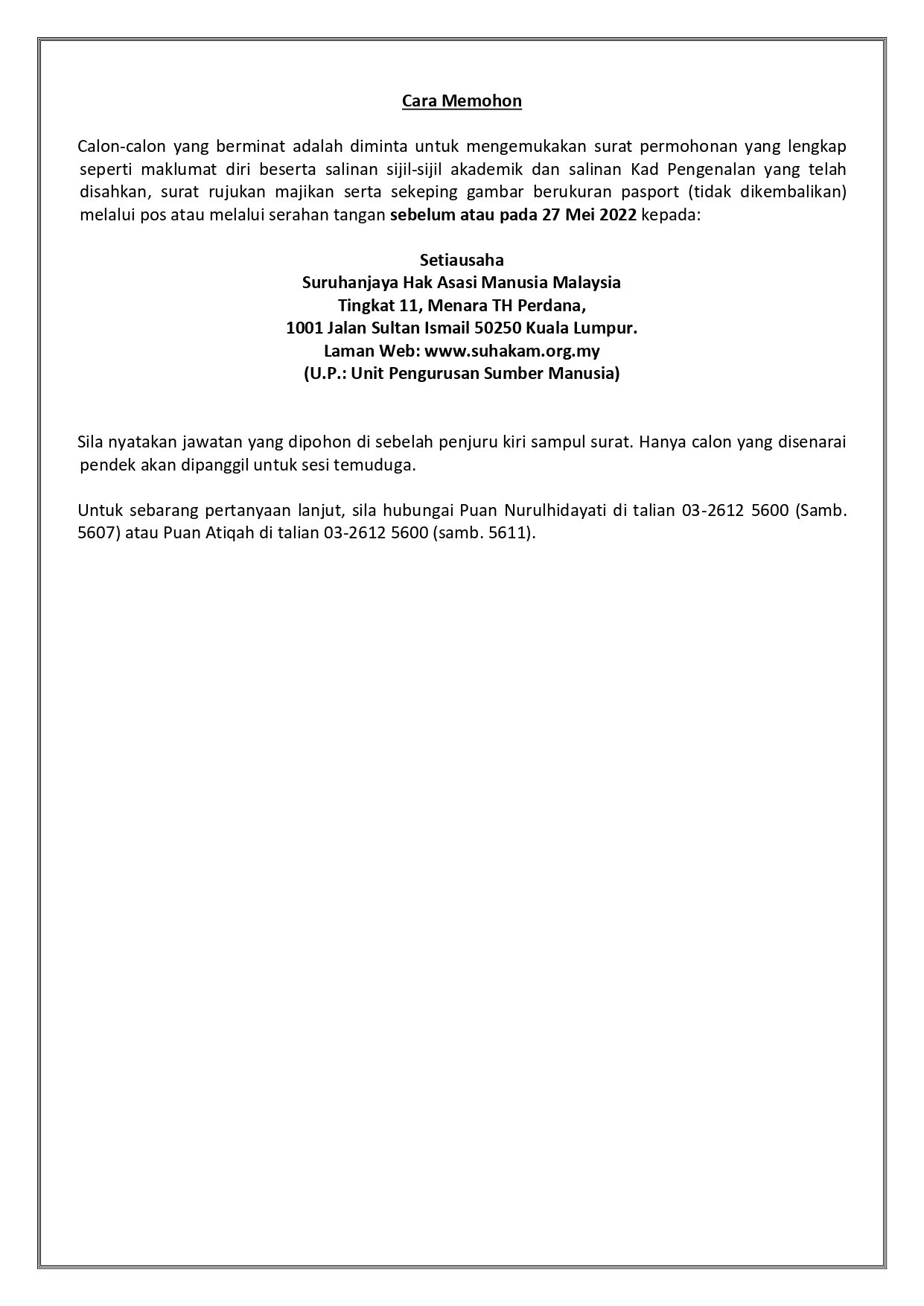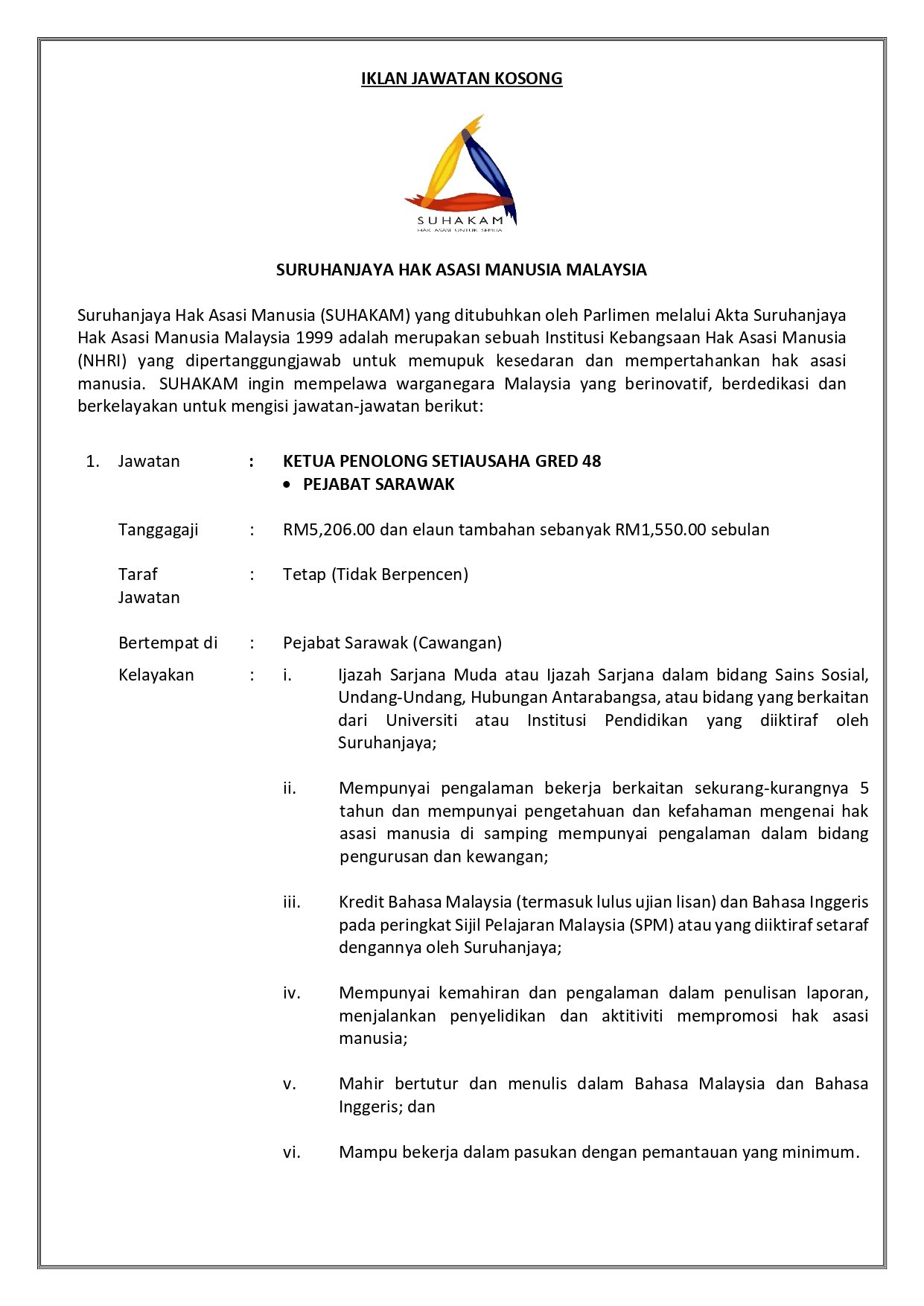 Iklan Jawatan Suruhanjaya Hak Asasi Manusia Malaysia (SUHAKAM)