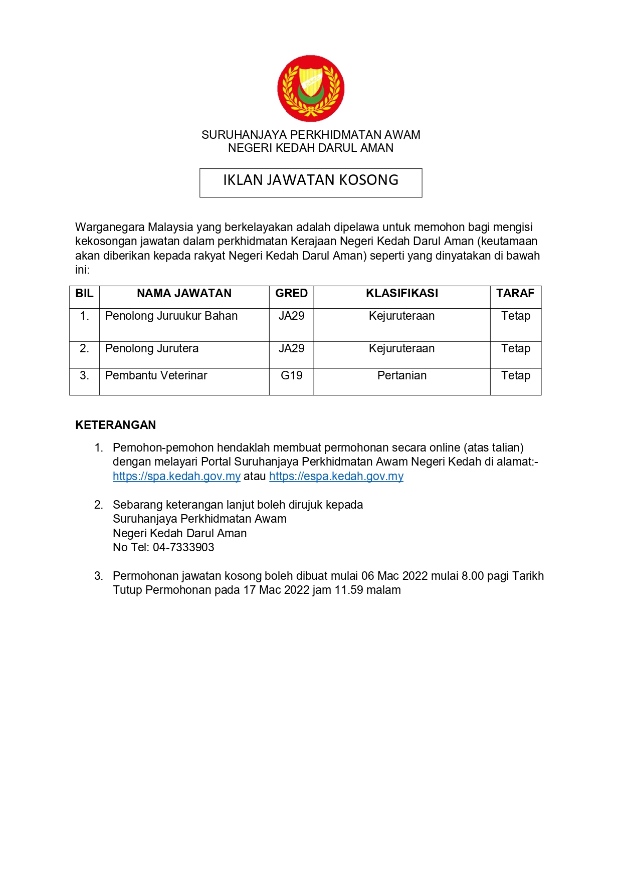 Iklan Jawatan Suruhanjaya Perkhidmatan Awam Negeri Kedah
