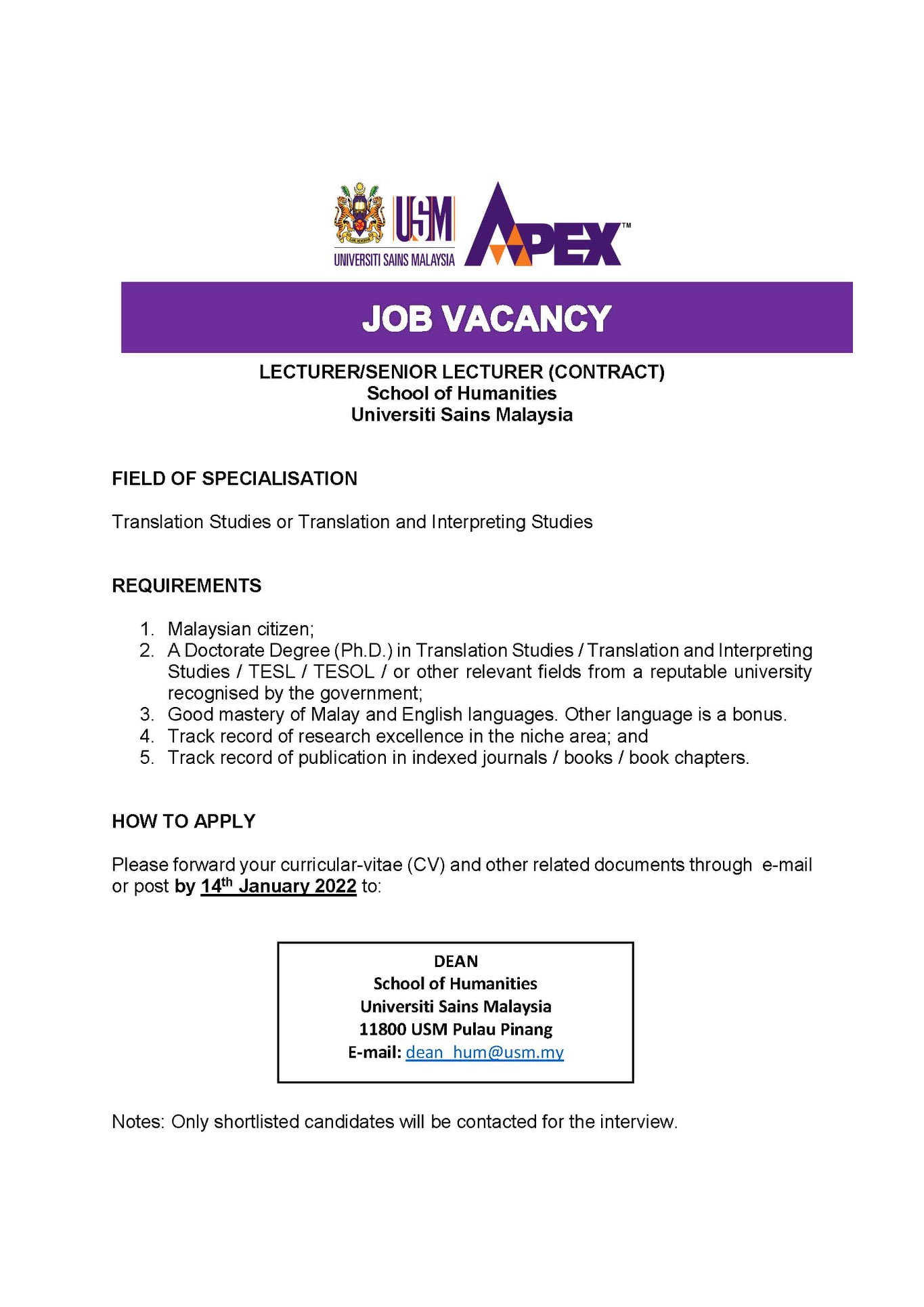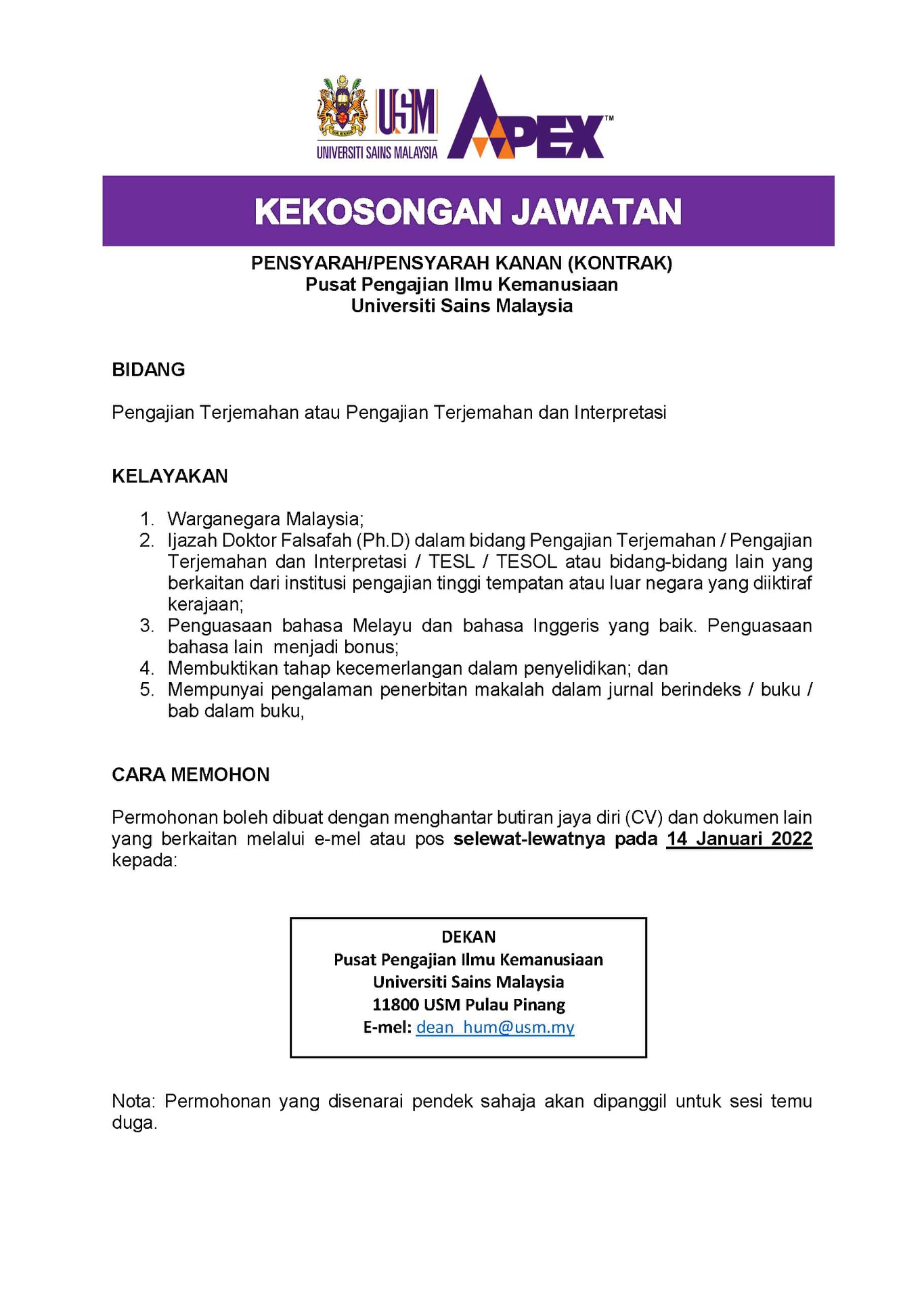 Iklan Jawatan Universiti Sains Malaysia
