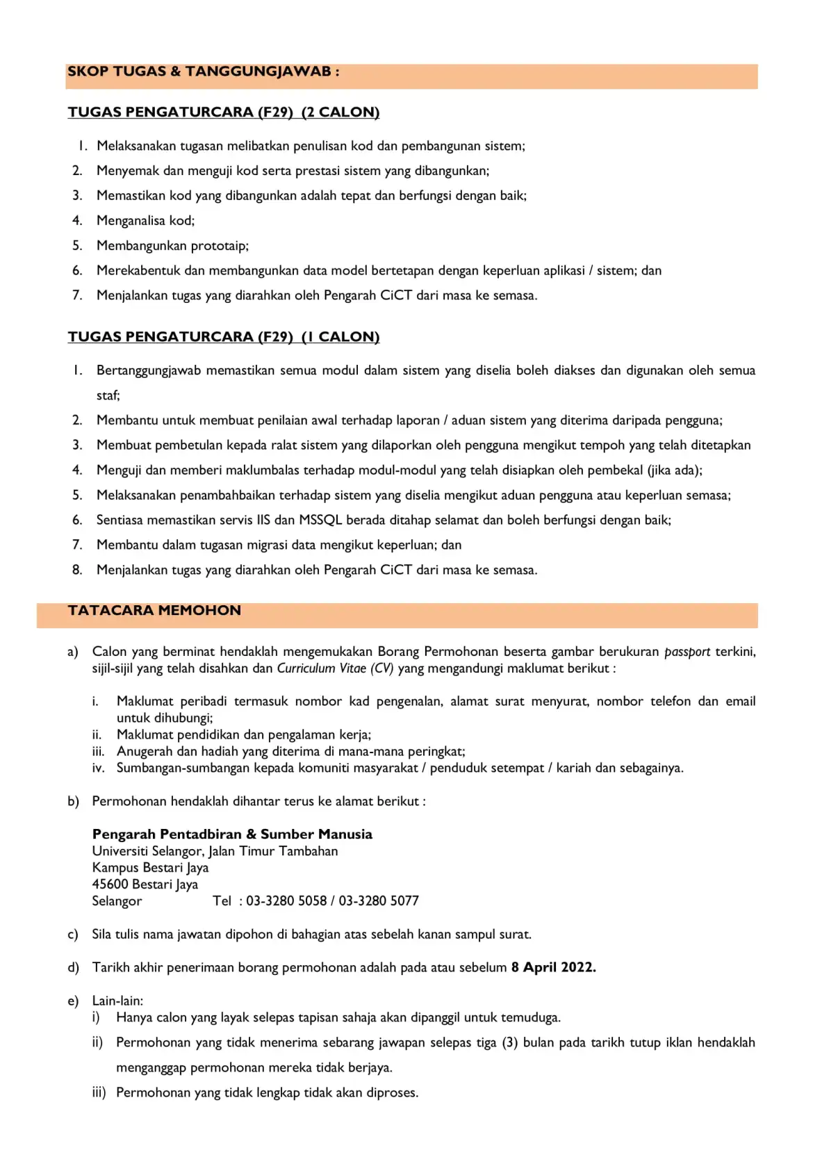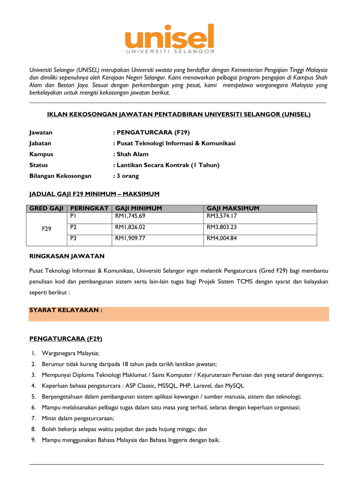 Iklan Jawatan Universiti Selangor (UNISEL)