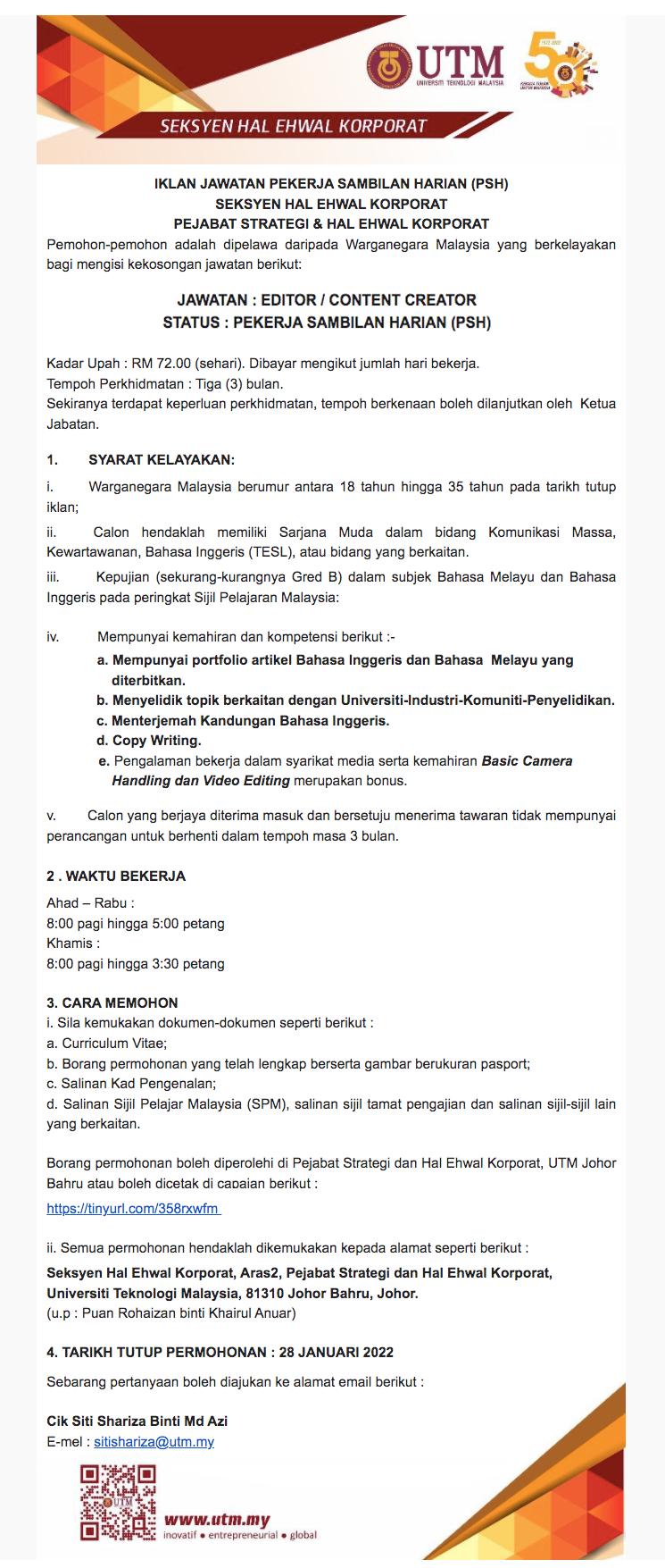 Iklan Jawatan Universiti Teknologi Malaysia (UTM)