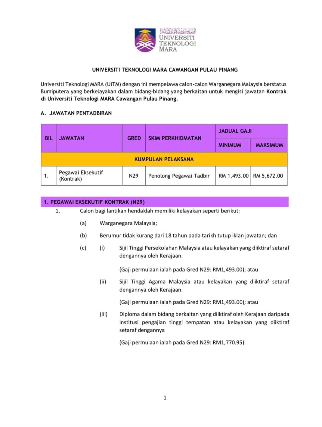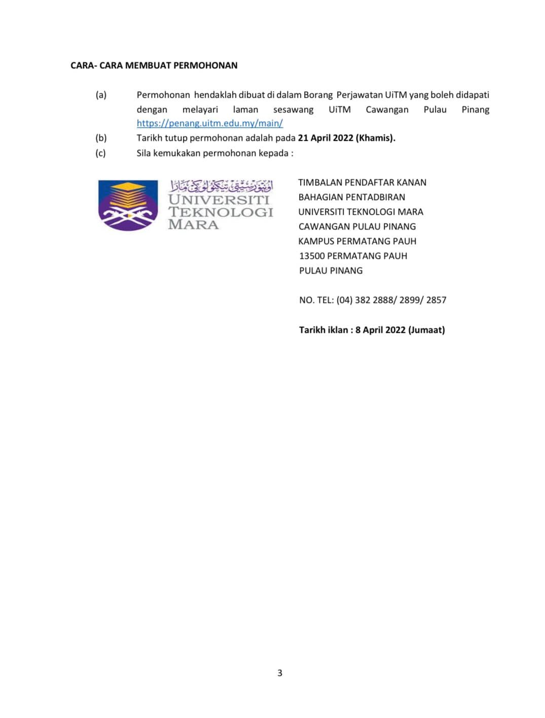 Iklan Jawatan Universiti Teknologi Mara (Uitm)