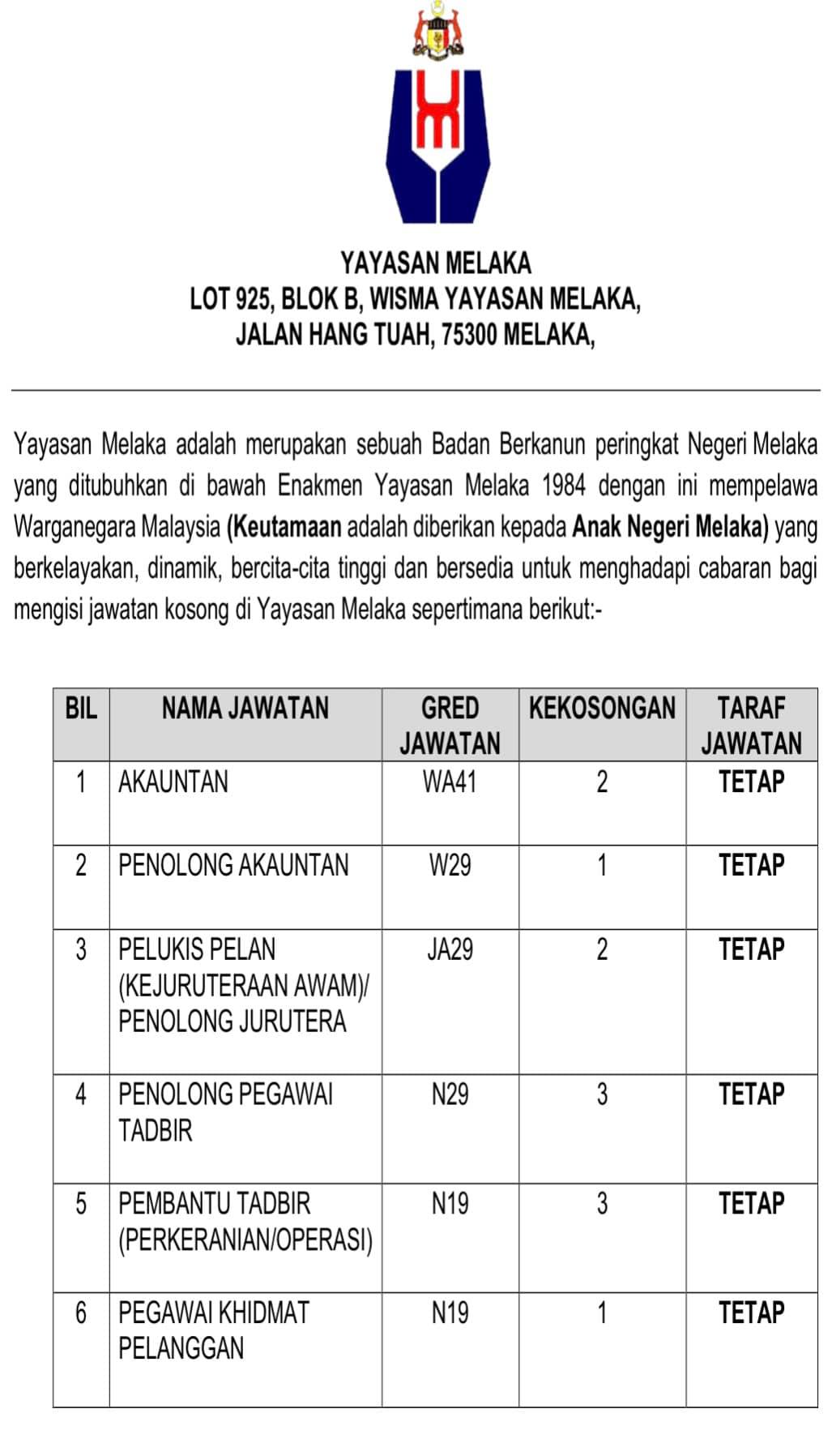 Iklan Jawatan Yayasan Melaka