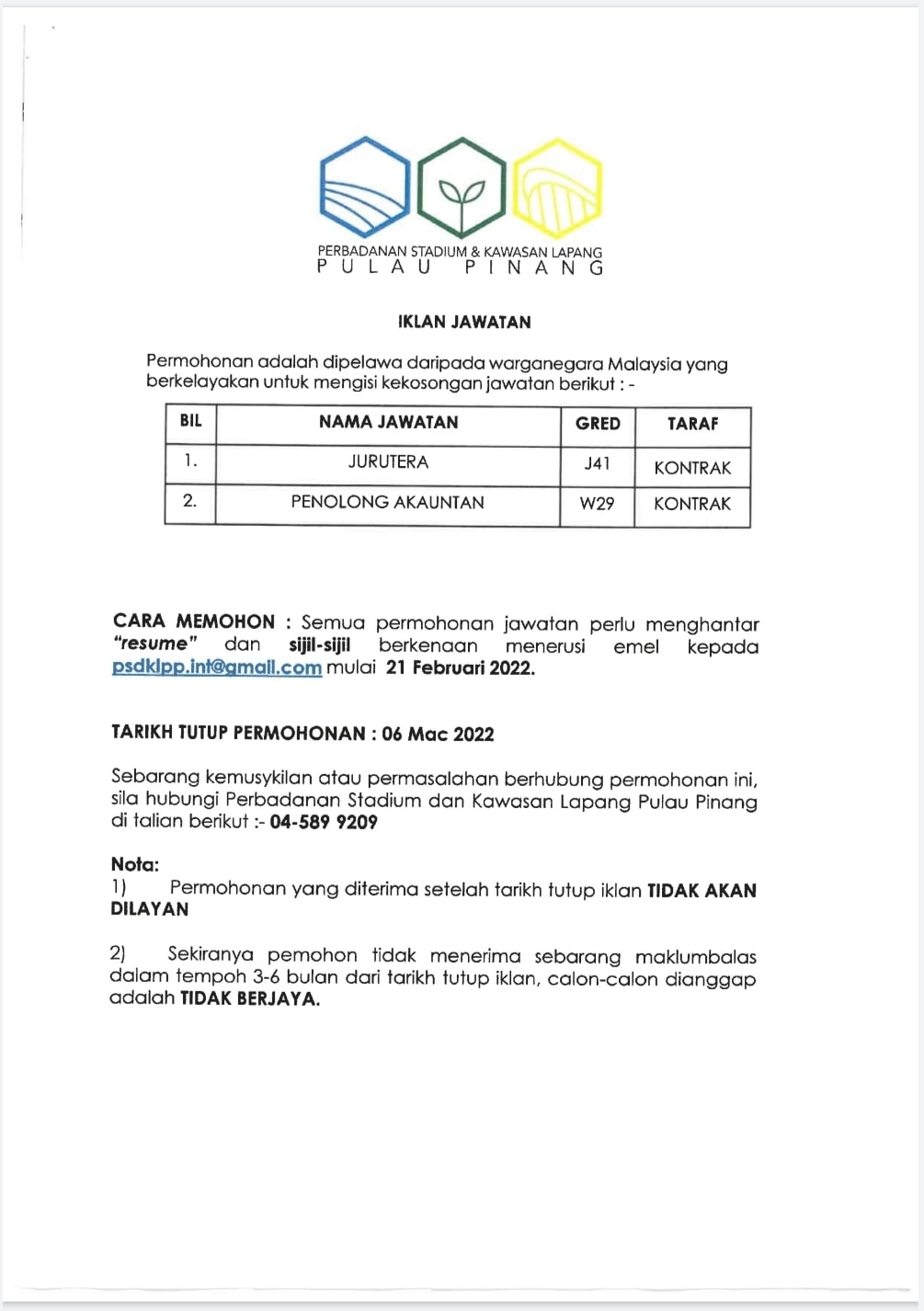 Iklan Jawatan Perbadanan Stadium & Kawasan Lapang Pulau Pinang