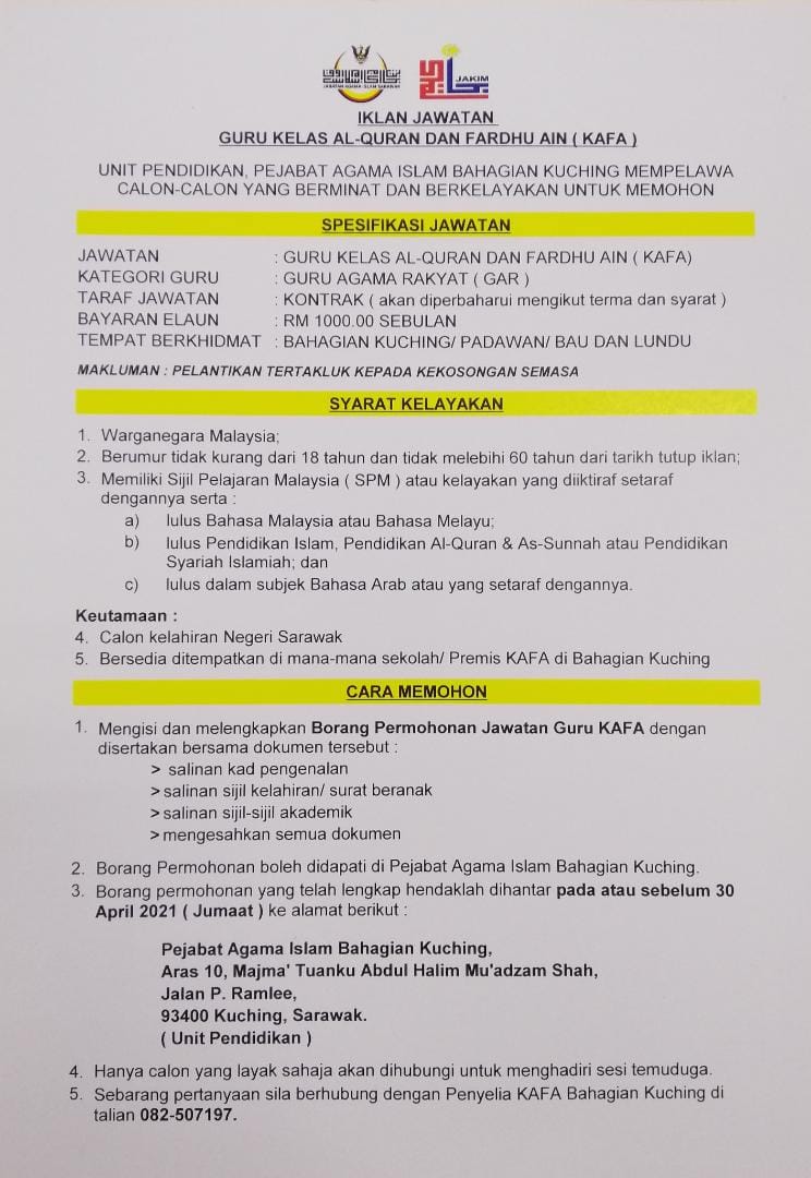 Jawatan Kosong Pejabat Agama Islam Bahagian Kuching