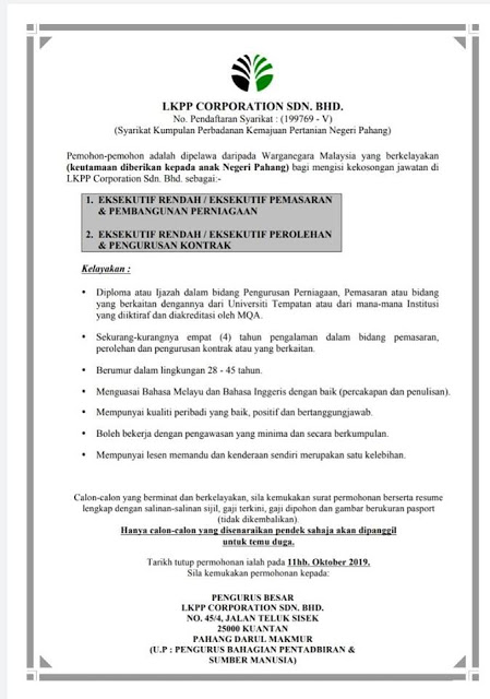 - Tarikh Tutup Permohonan: 11 Oktober 2019