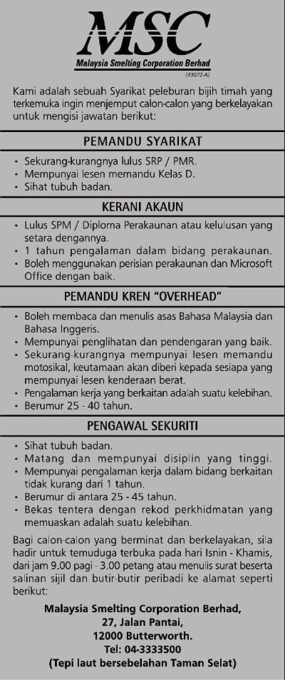 - Nama Majikan: Malaysia Smelting Coporation Berhad
