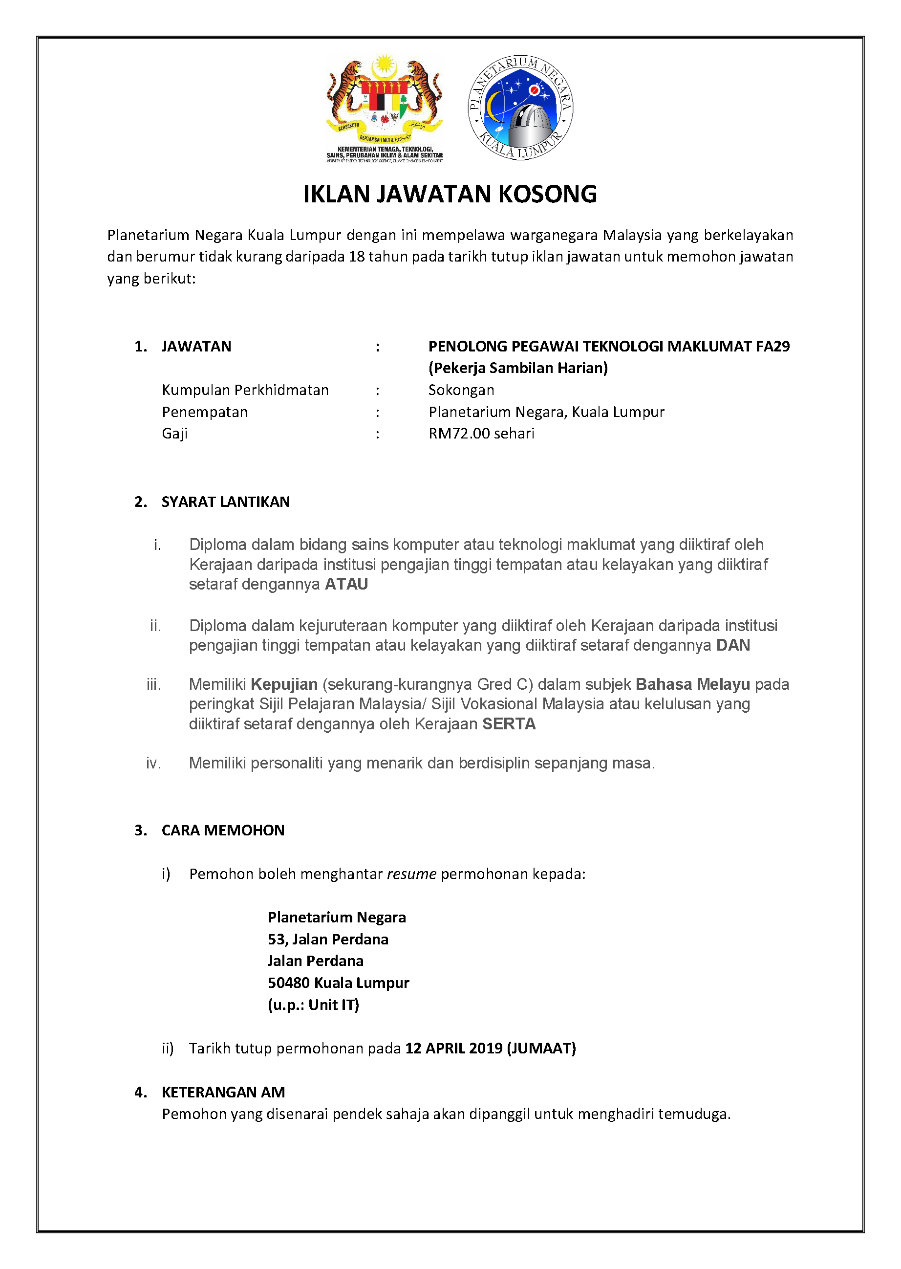 - Tarikh Tutup Permohonan: 12 April 2019